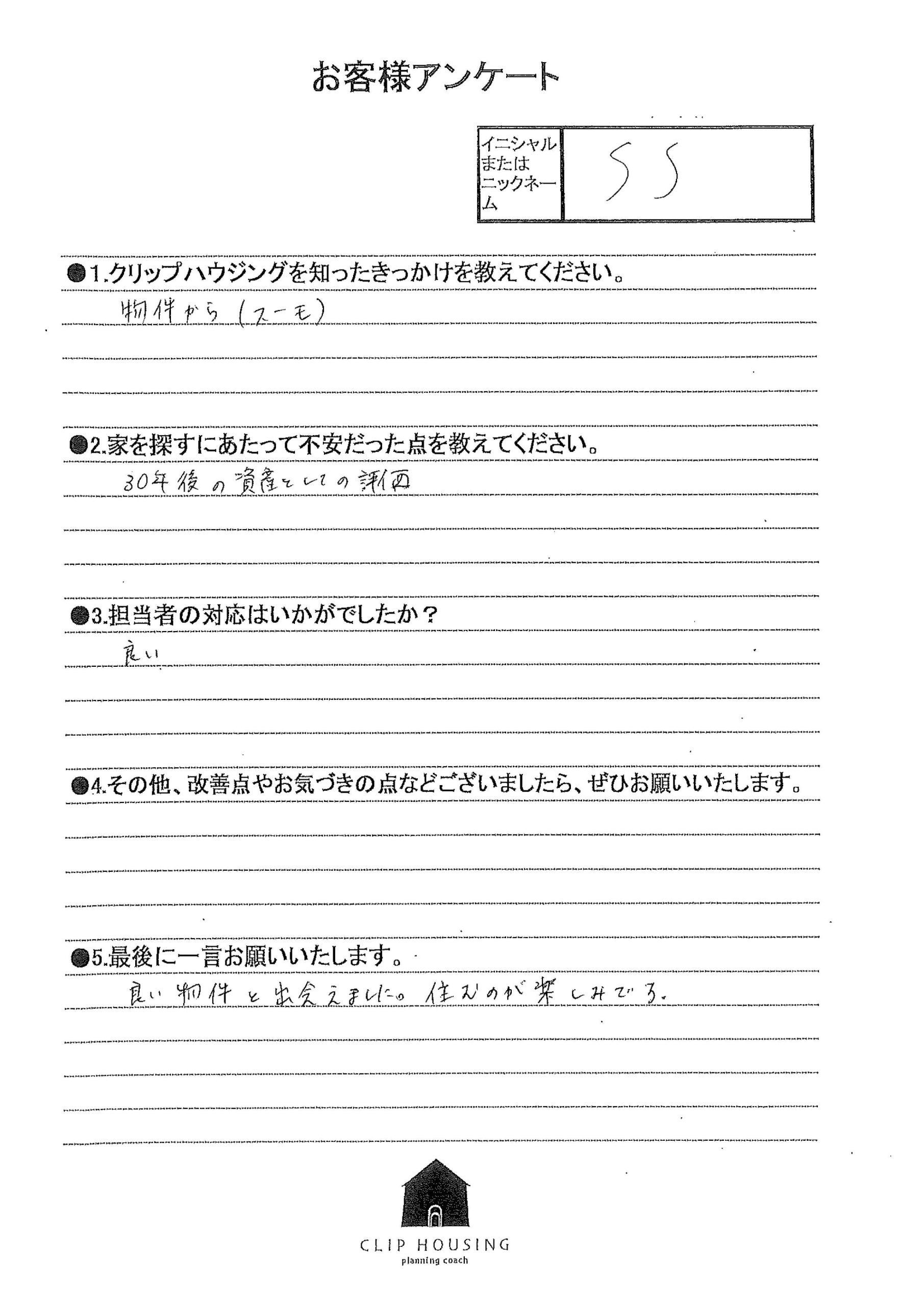 この度は物件をご購入いただき、誠にありがとうございます。また、アンケートにご協力いただき、重ねて感謝申し上げます。ご希望の物件が良いタイミングでご紹介できたこと、大変嬉しく思っております。 今後も住宅に関して何かお困り事がございましたら、「鈴木」までお気軽にご連絡ください! もし、また機会があればぜひ宜しくお願い致します。気軽にご相談頂けたら大変幸いでございます。 引き続き、どうぞ宜しくお願いいたします! 担当者より